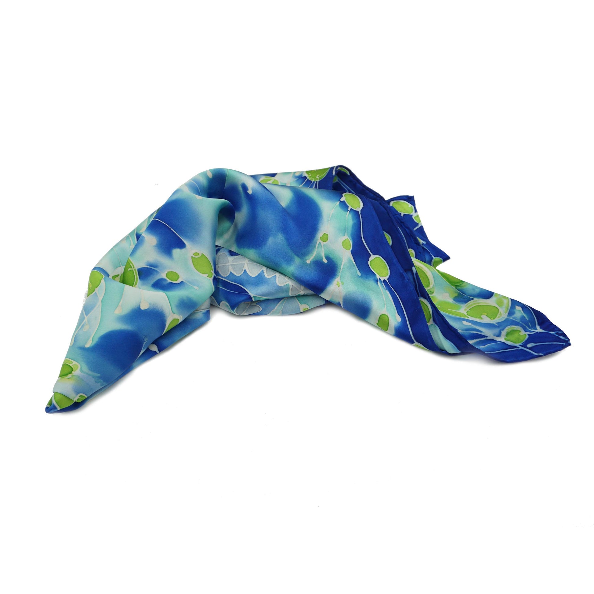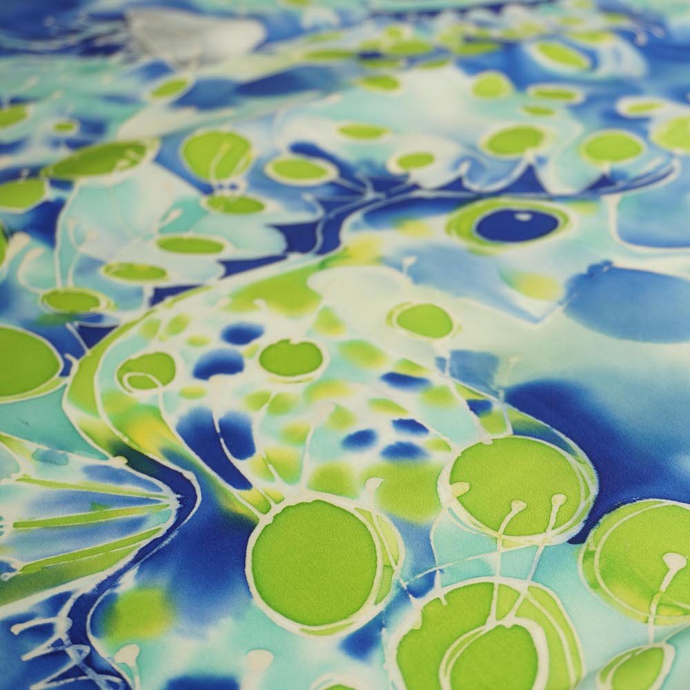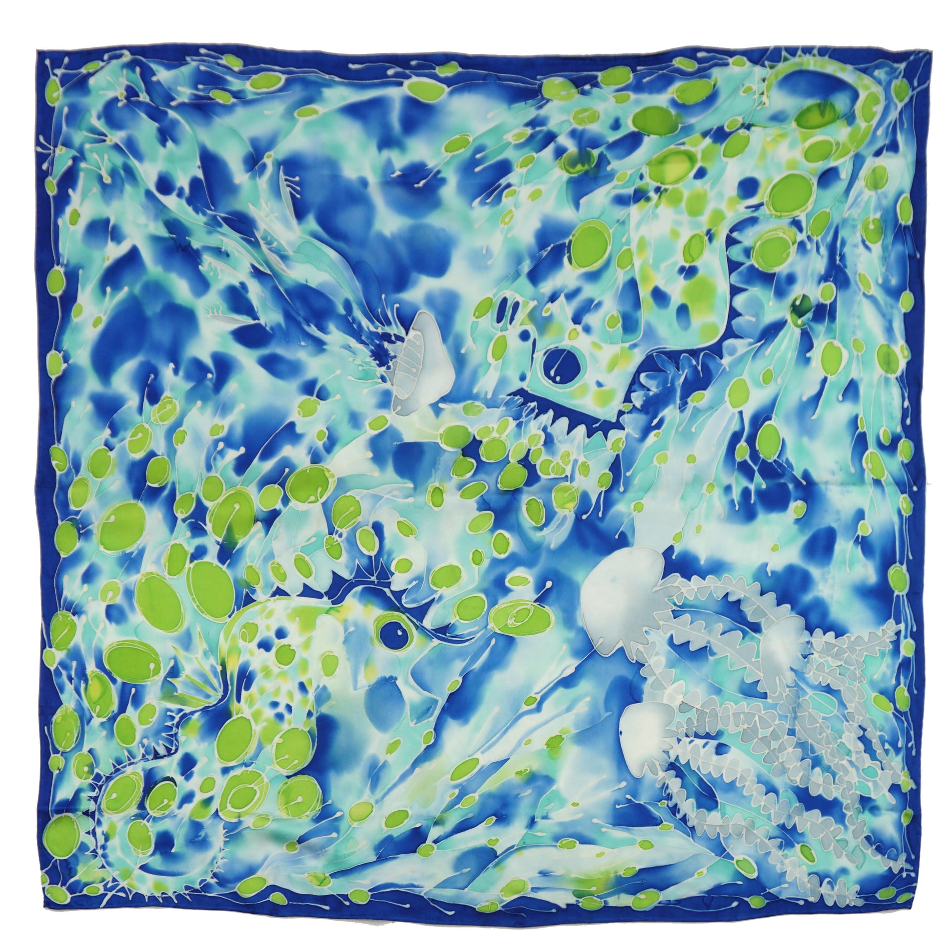 Blue, green and silver tones create an elegant camouflage for jellyfish and sea-dragons in this hand-dyed, silk charmeuse scarf. Looks particularly stunning with a black, gray, white or even a green dress or top.