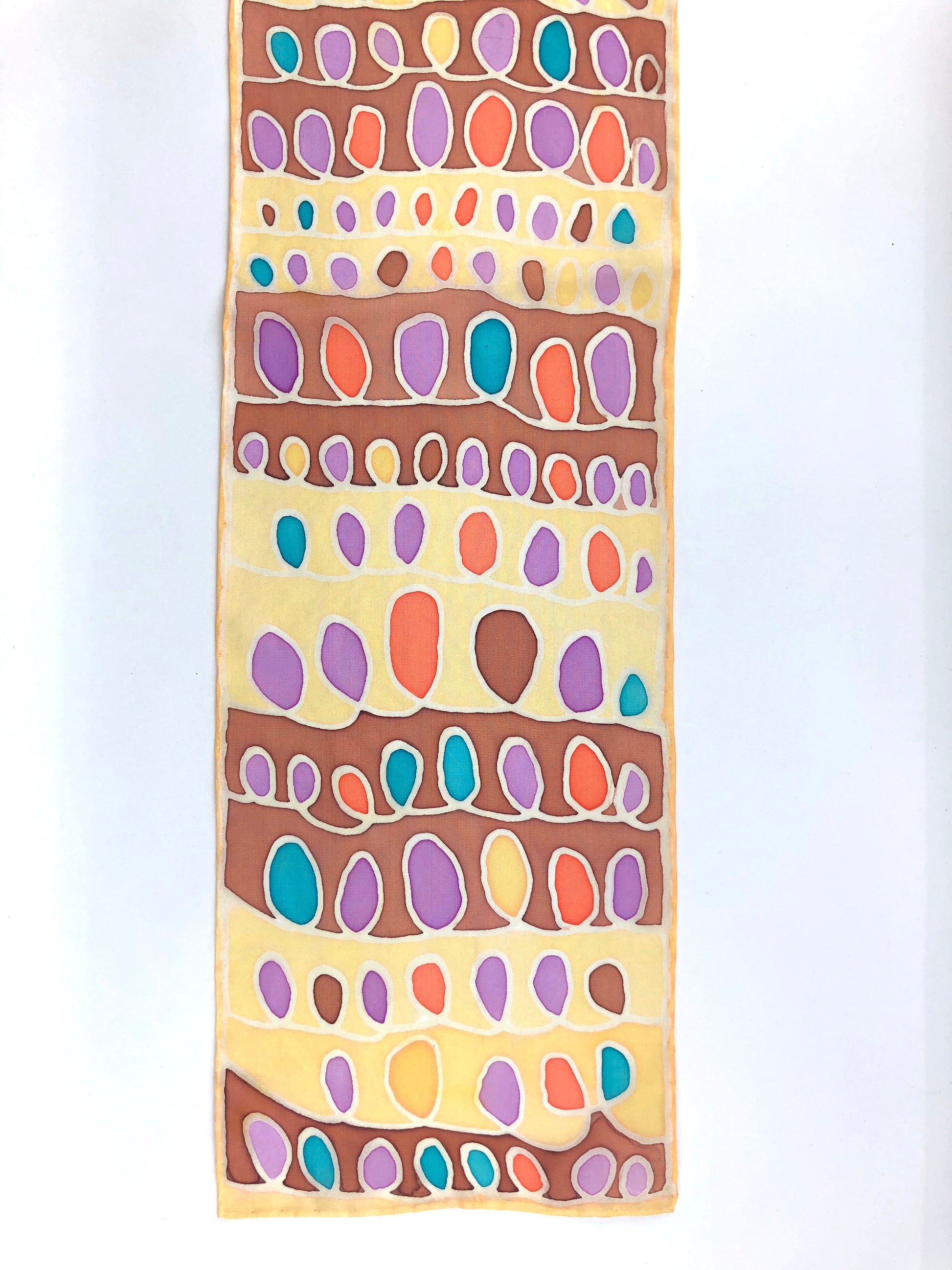The serti technique drawing in purples, marine green, tobacco brown and tangerine over a buttery background.
