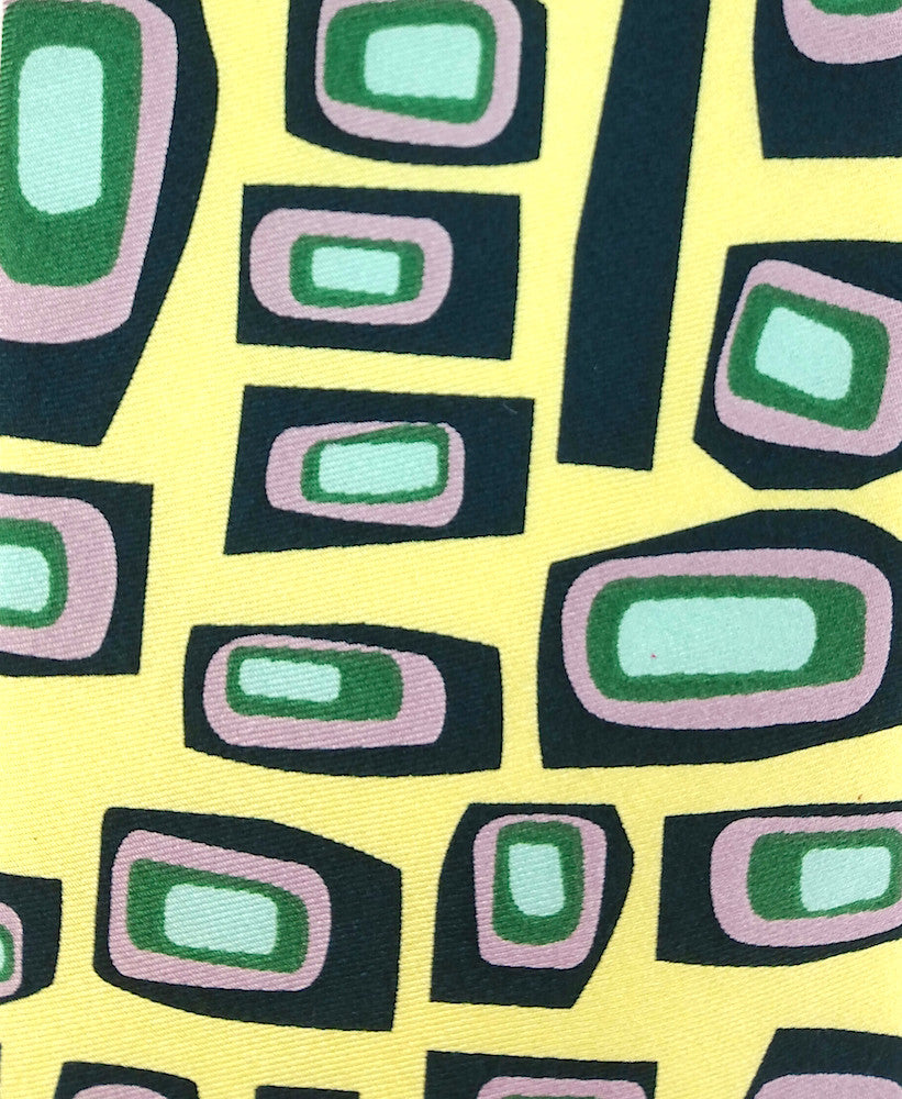 Called Paperclips, our original mid-century style pattern here in charcoal black, nut brown, spinach green and mint green on a bright banana pepper background.